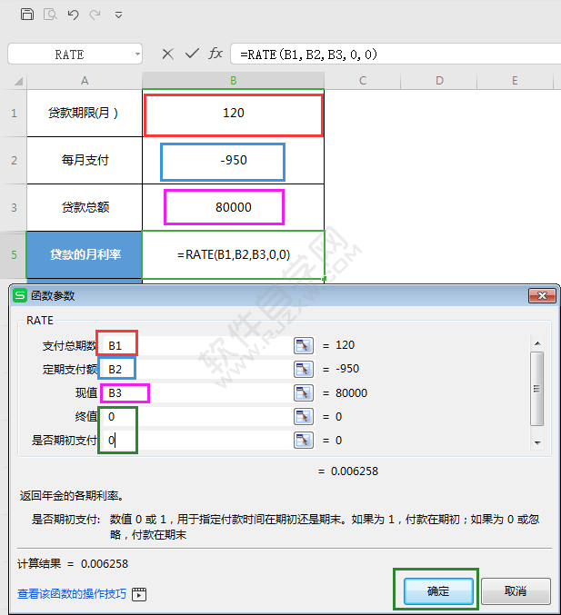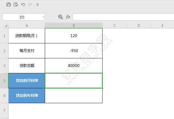 RATE函数的定义:返回年金的各期利率。函数RATE通过迭代法计算得出,并且可能无解或有多个解。如果在进行20次迭代计算后, 函数RATE的相邻两次结果没有收敛于0.0000001,函数RATE将返回错误值 #NUM!。 RATE函数的语法:RATE(nper,pmt,pv,fv,type,guess) 有关函数RATE中参数的详细说明,请参阅函数PV。 1、nper为总投资期,即该项投资的付款期总数。 2、pmt为各期付款额,其数值在整个投资期内保持不变。通常 pmt 包括本金和利息,但不包括其他费用或税金。如果忽略了 pmt,则必须包含 fv 参数。 3、pv为现值,即从该项投资开始计算时已经入帐的款项,或一系列未来付款当前值的累积和,也称为本金。 4、fv为未来值,或在最后一次付款后希望得到的现金余额,如果省略 fv,则假设其值为零,也就是一笔贷款的未来值为零。 5、type数字0或1,用以指定各期的付款时间是在期初还是期末。 6、guess为预期利率。 7、如果省略预期利率,则假设该值为10%。 8、如果函数RATE不收敛,请改变guess的值。通常当guess位于0到1之间时,函数RATE是收敛的。 RATE函数的使用方法:1、打开EXCEL软件,创建表格文件,输入下面的参数出来,效果如下: