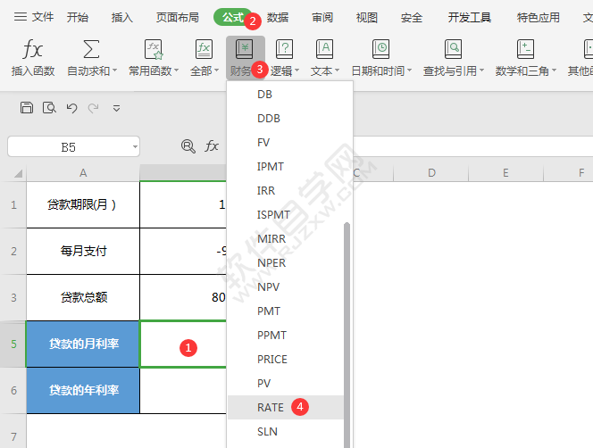 2、点击单元格,点击公式菜单--点击财务函数--点击RATE函数。