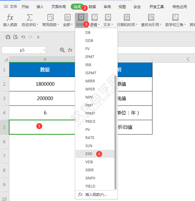 2、点击单元格,点击公式菜单--点击财务函数--点击SYD函数。
