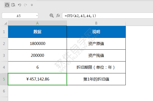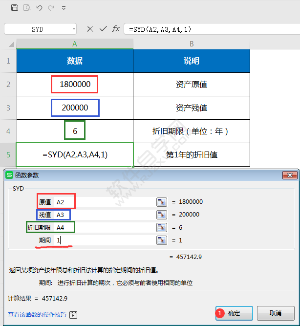 3、弹出SYD函数,原值选择A2,残值选择A3,折旧期限选择A4,期间输入1,点击确定。效果如下:
