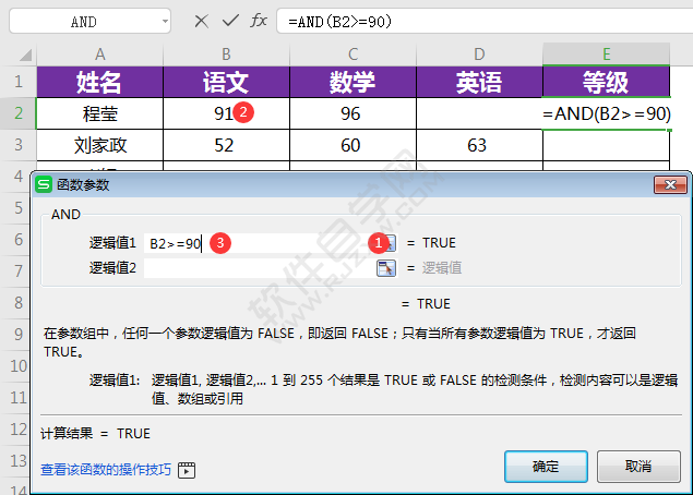 3、弹出AND函数参数面板,逻辑值1选B2后输入>=90。意思是语文要求>=90分。