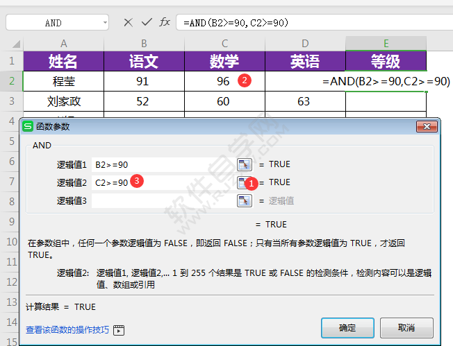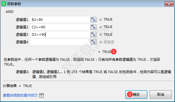 4、逻辑值2选择C2的数学,输入输入>=90,代表数学大于等90分的要求。