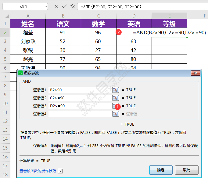 AND的定义:所有参数的逻辑值为真时,返回 TRUE;只要一个参数的逻辑值为假,即返回 FLASE。 AND的语法AND(logical1,logical2, ...) Logical1, logical2, ... 表示待检测的 1 到 30 个条件值,各条件值可为 TRUE 或 FALSE。 and函数的使用方法:1、准备好数据表格。用来学习AND函数。