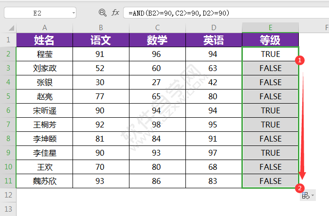 7、然后拖下公式,如果学员分数,只要有一个没有满足设置的条件,都会显示FALSE, 要全部满足了条件就会显示TRUE。