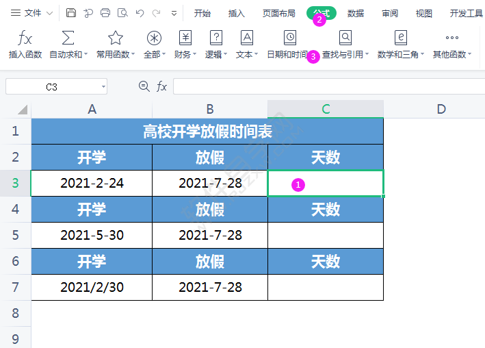 2、点击天数下的【单元格】,点击【公式】菜单,点击【日期与时间函数】。
