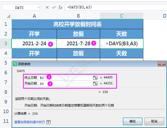 days函数的语法与定义: DAYS(end_date, start_date) DAYS 函数语法具有以下参数。 End_date 必需。 Start_date 和 End_date 是用于计算期间天数的起止日期。 Start_date 必需。Start_date 和 End_date 是用于计算期间天数的起止日期。 注意: Excel 可将日期存储为序列号,以便可以在计算中使用它们。默认情况下,1900 年 1 月 1 日的序列号是 1, 而 2008 年 1 月 1 日的序列号是 39448,这是因为它距 1900 年 1 月 1 日有 39447 天。