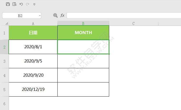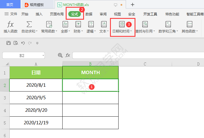 2、选中B2单元格,点击公式菜单,点击日期和时间函数的MONTH函数。