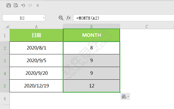 4、然后拖动复制公式就完成了提取月份。效果如下: