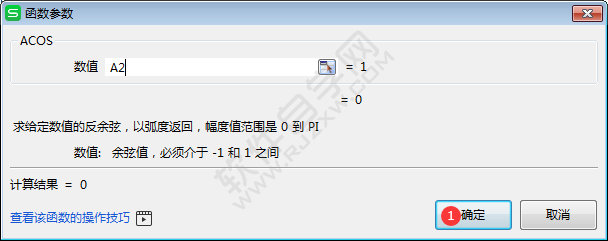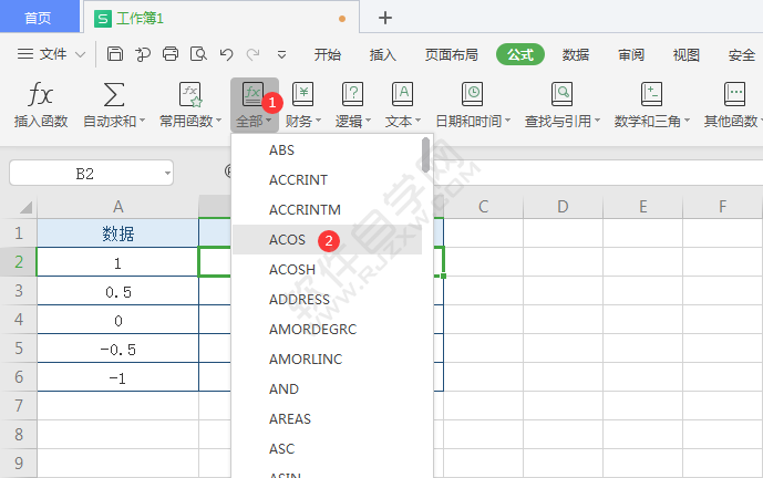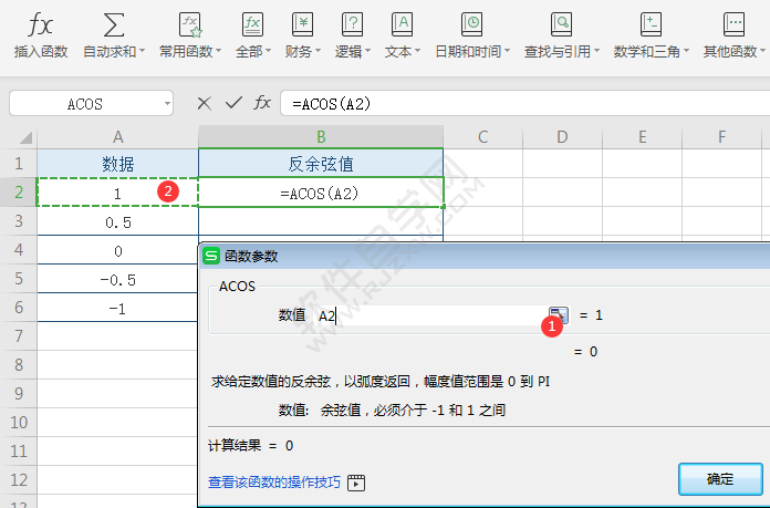 2、然后点击公式菜单--全部函数里面ACOS函数。效果如下: