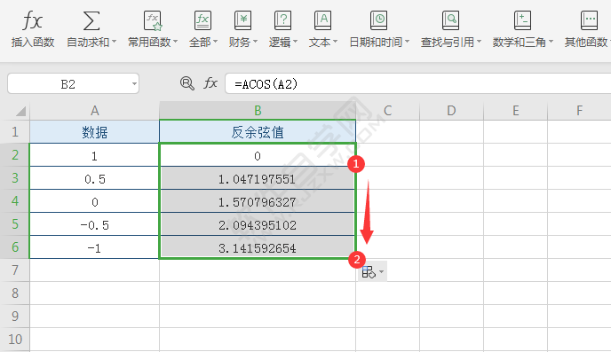 5、这样反余弦值就出来的了。点击右下角的加号拖下公式。所有的数据反余弦值都出来了。