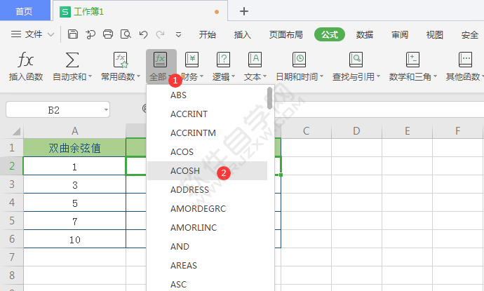 2、选择要插入函数的单元格,点击全部函数里的ACOSH函数。