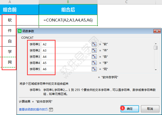 3、弹出CONCAT函数面板,字符串选一个单元格内容。选完后,点击确定。