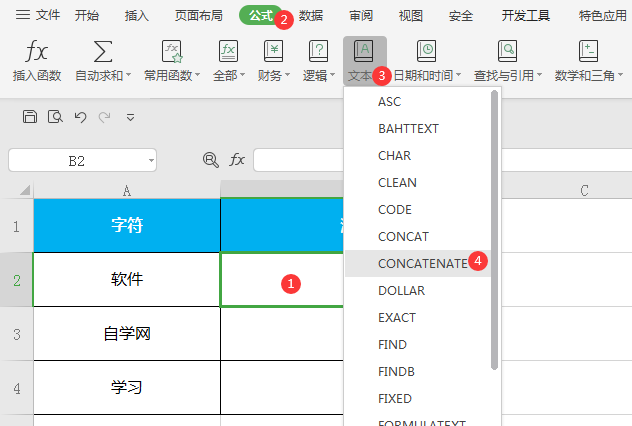 2、在单元格中,点击公式菜单,点击文本函数,点击CONCATENATE函数。