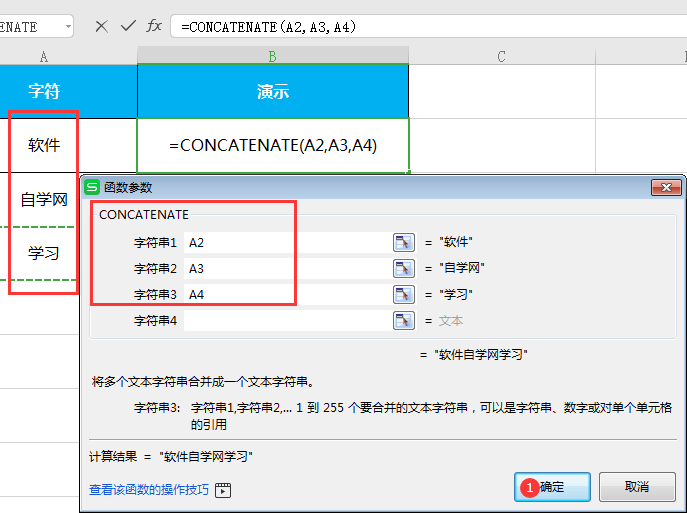 3、弹出CONCATENATE函数面板,选择下面对应的数据单元格,点击确定。