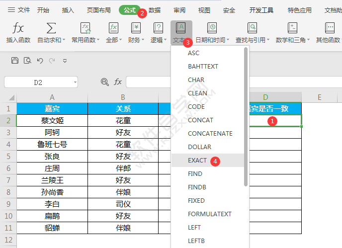 2、点击单元格,点击公式菜单--点击文本函数--点击EXACT函数。效果如下: