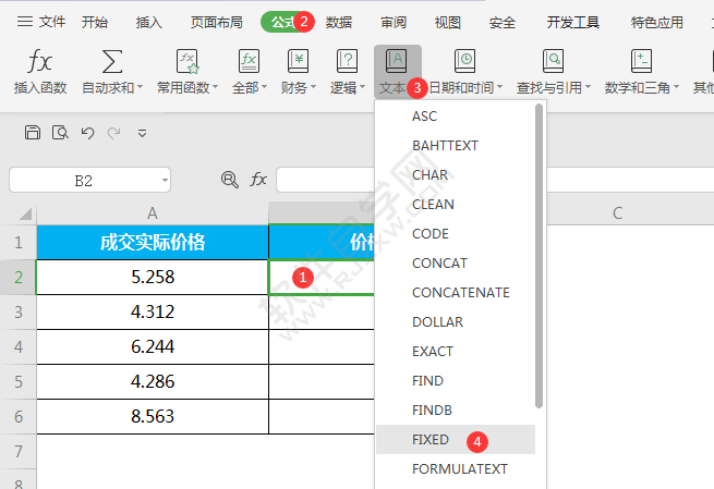 2、点击单元格,点击公式菜单,点击文本函数的FIXED函数。