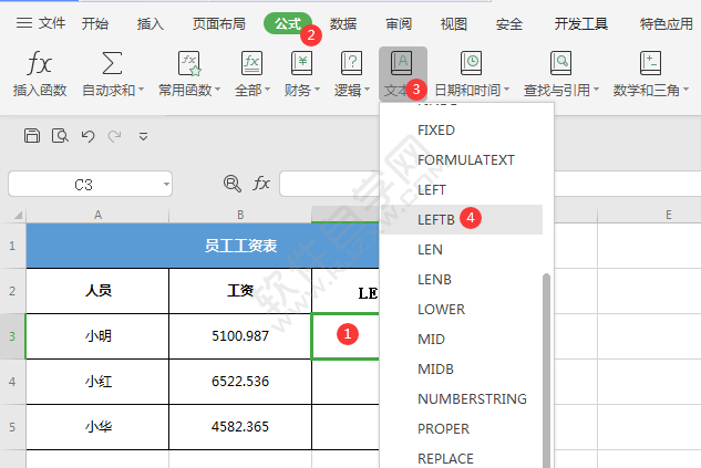 2、选择单元格,点击公式菜单--点击文本菜单--点击LEFTB函数。