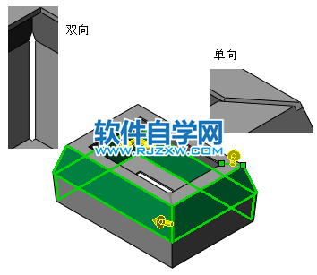 (1)、如果您选择了 K-因子、折弯系数、或折弯扣除,设定一个数值。 (1)、如果您选择矩形或矩圆形,则设定释放槽比例。 (2)、所设定的选项及为折弯半径、折弯系数及自动切释放槽指定的数值会成为您下一个新生成的钣金零件的默认设定。 8、欲与圆角折弯使用切口特征,在切口参数下: (1)、选择内部或外部边线(您也可选择线性草图实体)。