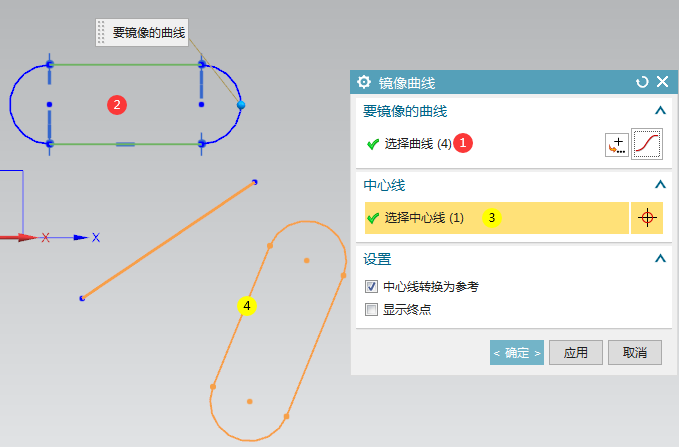 4、弹出镜像曲线面板,选择要镜像的曲线。一共四条。然后再选中心线。在这里选择X轴。就可以镜像出来了。