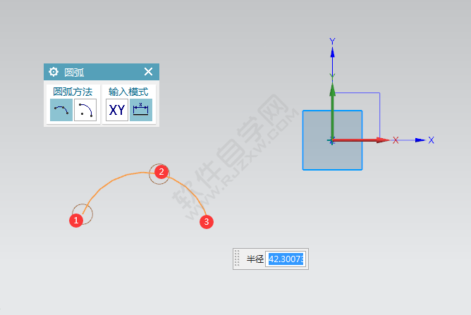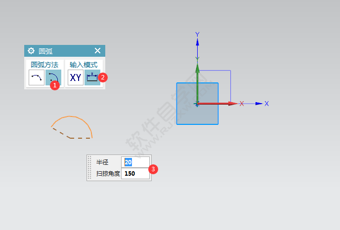 3、点击直接草图的圆弧:就会弹出圆弧面板。效果如下: