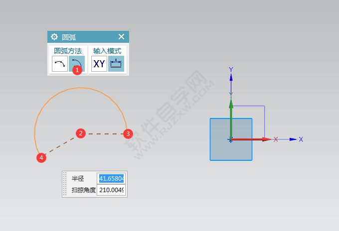 6、输入方法也有二种,X输入半径与扫掠角度后,点击中心点就好了。