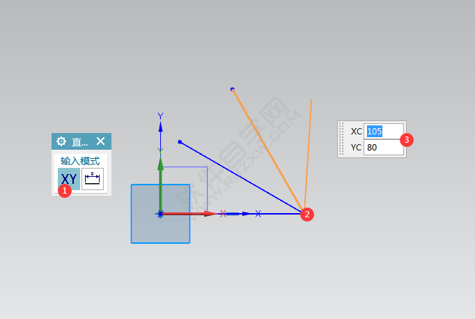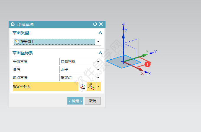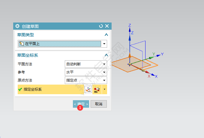 3、选择XY坐标,点击确定,完成XY草图模式,进入下一步。