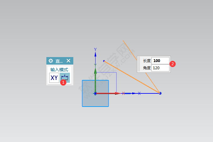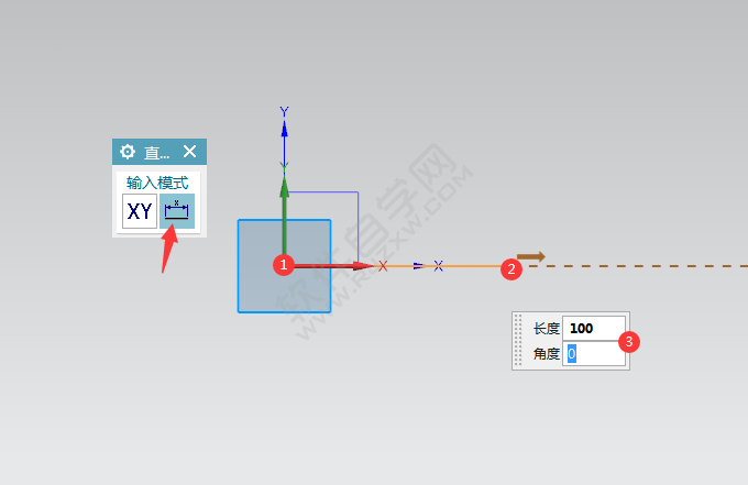 5、直线输入模式有两种,一种是XY,一种是尺寸模式。点击起点,输入长度100,就是尺寸模式。