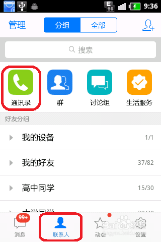 想要实现不同手机间通讯录的同步及导入导出操作很简单,重要是利用QQ备份通讯录来实现通讯录的导出和导入操作。在其中一台手机中打开手机QQ,利用自己的QQ账号进行登陆(必须是同一账号),切换至“联系人”选项卡,点击“通讯录”按钮。