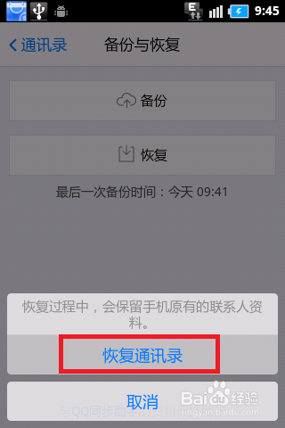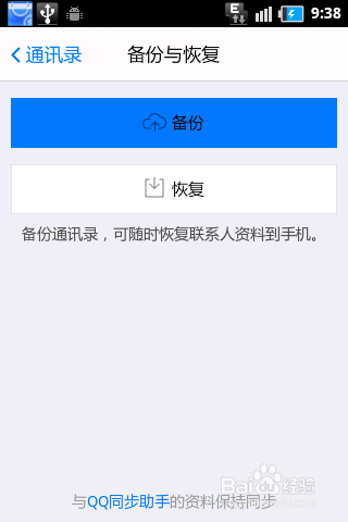 接下来在其它想要导入通讯录的设备上(如苹果手机)利用同一QQ账号进行登陆。并利用同样的操作,在“备份与恢复"界面中,点击”恢复”按钮,就可以实现通讯录的导入及同步操作啦。
