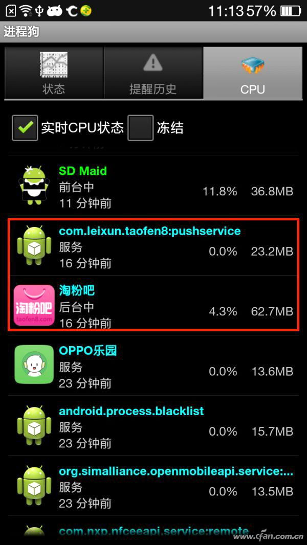 03 进程狗寻找对应APP来源 接下来运行进程狗并进入CPU选项卡界面,点击手机菜单键所选按时间顺序筛选,找到与15分钟前附近对应的CPU事件。由此可见,这个时间段内Libs文件夹里的文件都是“淘粉吧”APP生成或推送的文件,并非关键数据,因此可以有选择性地删除。总之,这个方法的原理就是利用SD卡女佣确定时间点,然后根据时间点用进程狗锁定对应的CPU时间从而与具体APP对上号。以淘粉吧这个APP为例,用垃圾清理软件可以只能清理对应的taofen文件夹,从而错过了Libs目录内的文件。笔者在这里也只是抛砖引玉,利用类似方法还能玩出更多花样,就让我们一同探索吧。