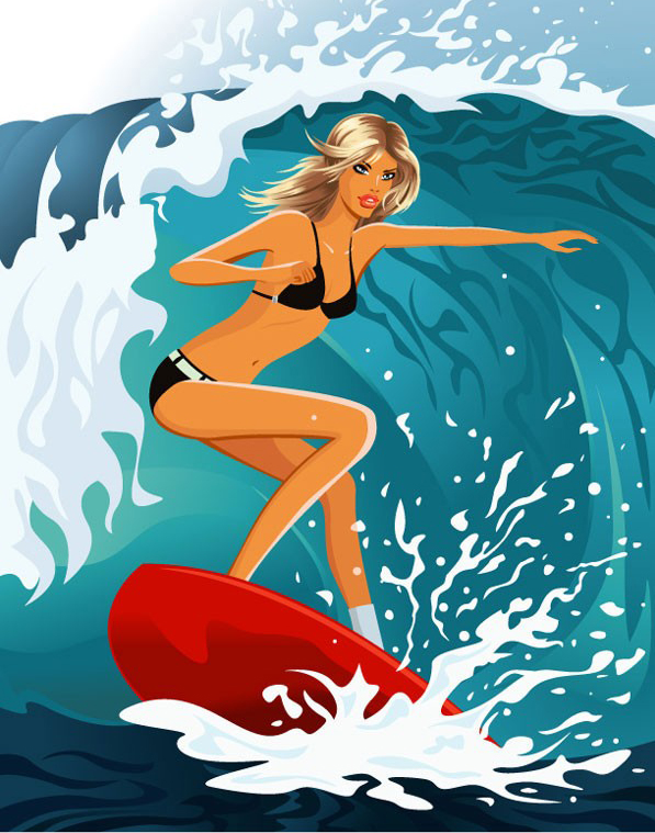 EPS格式,含JPG预览图,关键字:矢量人物,矢量运动,女性,冲浪,大海,海浪,泳装,矢量素材