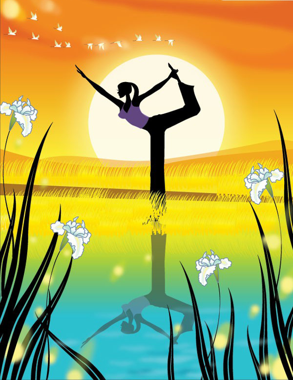 AI格式,含JPG预览图,关键字:人物,矢量,女孩,时尚,运动,瑜伽,健身,户外,太阳,飞鸟,风景,湖水,花卉,草丛,人物倒影,矢量素材