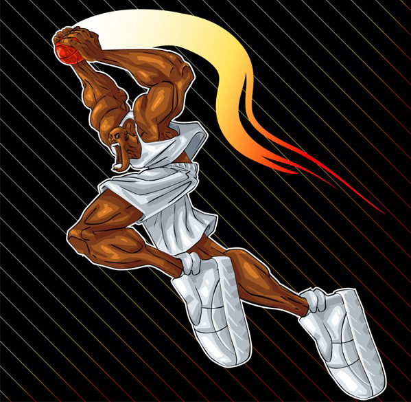 EPS格式,含JPG预览图,关键字:矢量人物,体育运动,篮球,扣篮,动作,漫画风格,跳跃,矢量素材