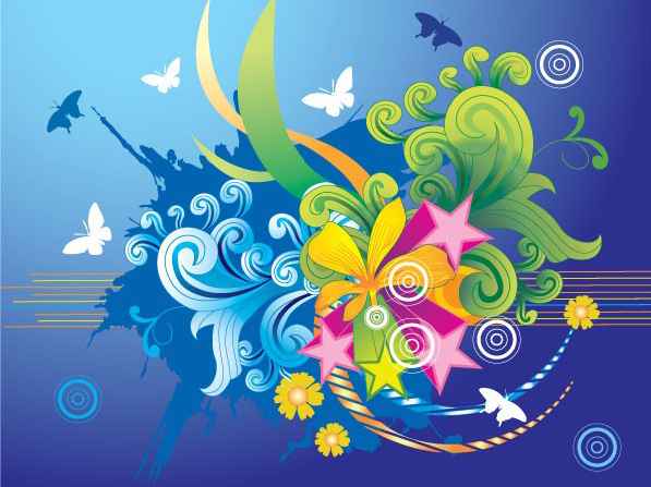 EPS格式,含JPG预览图,矢量潮流,潮流元素,植物,叶子,花卉,花朵,蝴蝶,剪影,五角星,矢量素材。