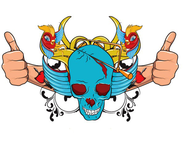 AI格式,含JPG预览图,矢量,潮流元素,植物花纹,骷髅头,心形,箭,小鸟,手,恐怖,流行,插画,矢量素材。