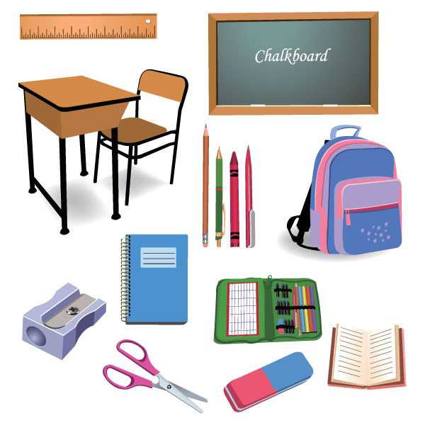 EPS格式,含JPG预览图,矢量文具,学生文具,课桌,椅子,黑板,书包,铅笔盒,笔记本,笔,铅笔刀,尺子,学习用具,矢量素材