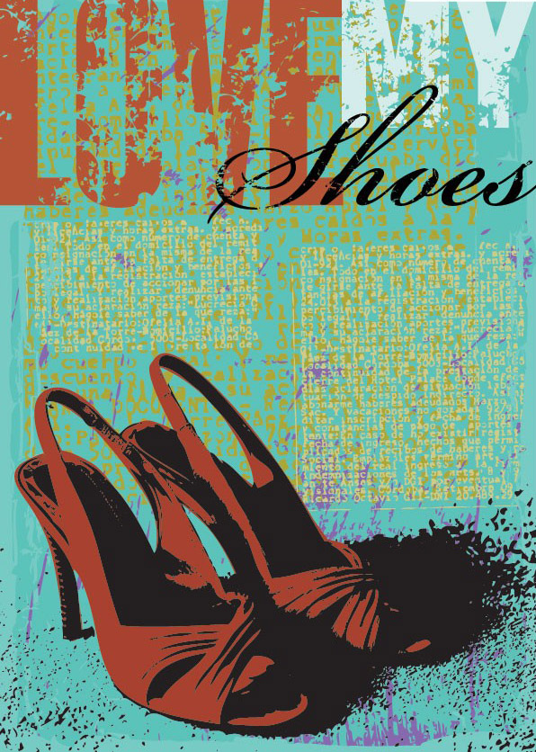 EPS格式,含JPG预览图,矢量鞋,高跟鞋,红色高跟鞋,复古,怀旧风格,墨迹,鞋子,字母,love my shoes,矢量素材...