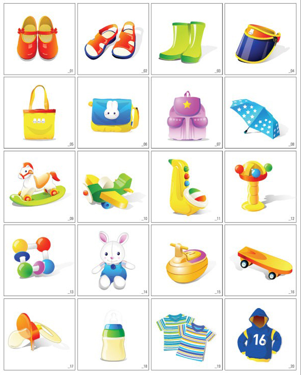AI格式,含JPG预览图,童鞋,书包,雨伞,木马,飞机,小兔子,手铃,滑板,奶嘴,童装,矢量素材... │ 彭志勇