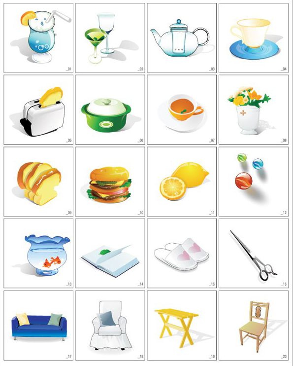 AI格式,含JPG预览图,茶杯,汉堡,面包钱,柠檬,金鱼,剪子,玻璃球,沙发,剪子,花瓶,矢量图标,矢量素材