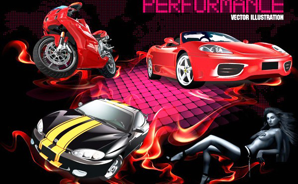 AI格式,含JPG预览图,矢量,交通工具,汽车,跑车,摩托车,逼真,写实风格,梦幻烟雾,女性,美女,性感女人,矢量素材