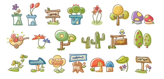 AI格式,含JPG预览图,卡通植物,仙人掌,蘑菇,小花,指路牌,矢量素材