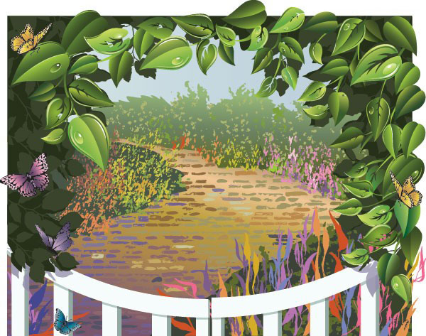优美的田间小路与植物矢量素材