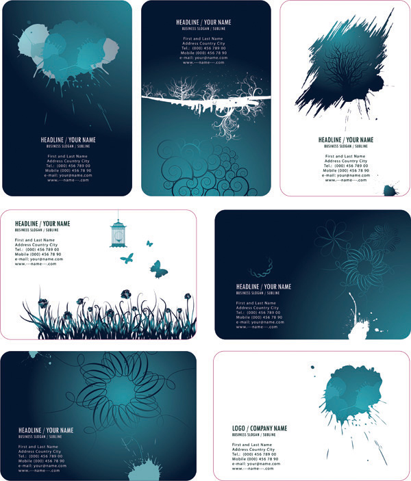 EPS格式,含JPG预览图,矢量卡片,卡片模板,卡片背景,蓝色,潮流元素,墨迹,花纹,蝴蝶,草丛,矢量素材