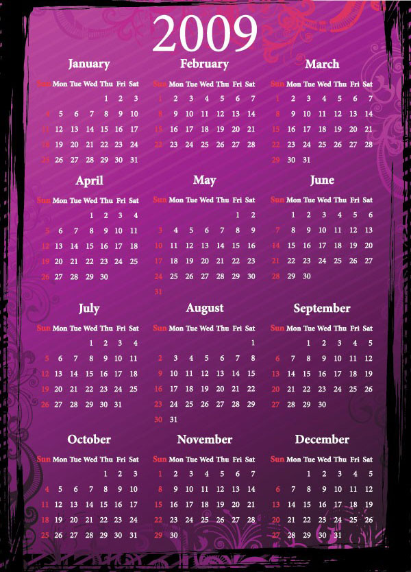 EPS格式,含JPG预览图,日历,紫色,花纹,撕裂边框,2009年,新年,花边,矢量素材