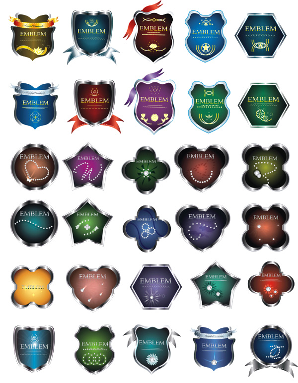 AI格式,含JPG预览图,关键字:矢量徽章,水晶徽章,金属质感,心形,五角星,形状各异,精美,矢量图