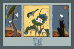 EPS格式,含JPG预览图,关键字:矢量壁画,装饰,国风,古朴,精美,传统,荷花,仙鹤,祥云,笔墨,矢量图