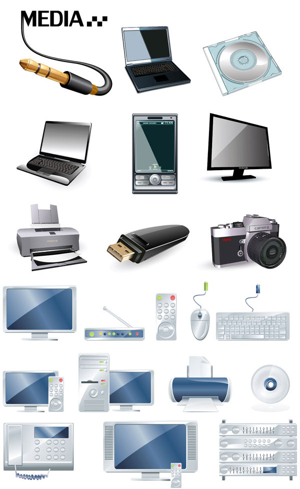 EPS格式,含JPG预览图,关键字:矢量数码,电脑,相机,U盘,打印机,鼠标,键盘,播放器,矢量图
