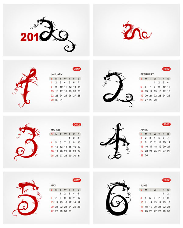 EPS格式,含JPG预览图,关键字:2012年,日历,模板,台历,插画,线稿,中国龙,龙形,简笔画,数字,矢量图