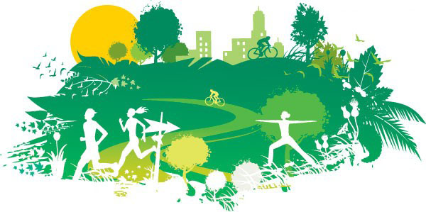 EPS格式,含JPG预览图,关键字:风景矢量素材,绿色,环保,矢量植物,矢量建筑,剪影,路标,叶子,草地,树木,小路,人物,自行车,运动,太阳,小鸟,矢量图