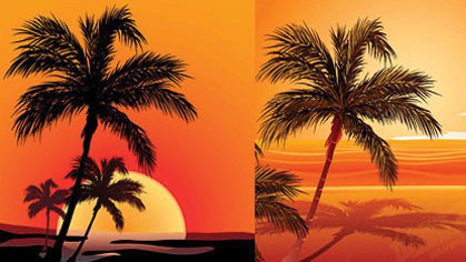 EPS格式,含JPG预览图,关键字:矢量风景,大海,日落,黄昏,沙滩,椰子树,剪影,金色,矢量图